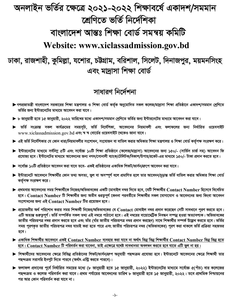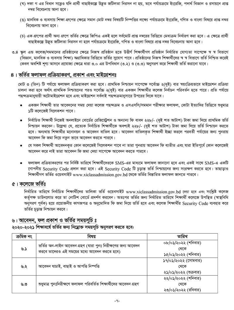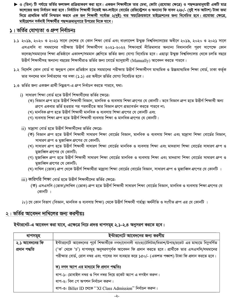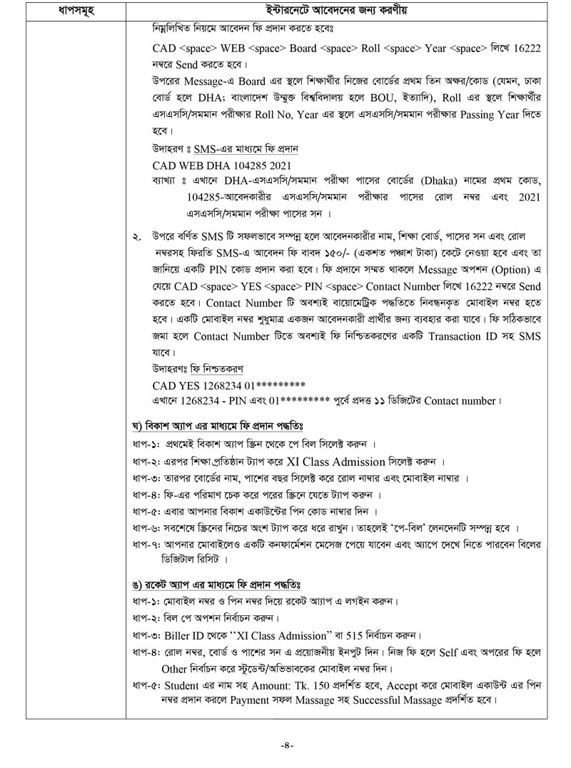 একাদশ শ্রেনী ভর্তির আবেদন নিয়মাবলী
