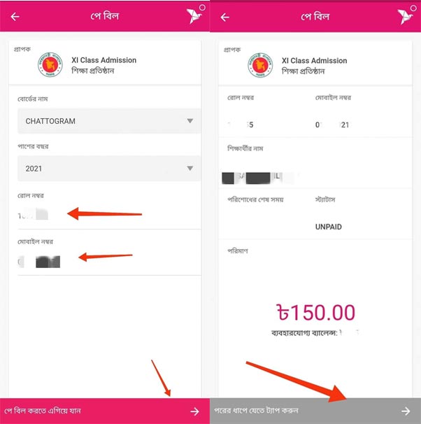 একাদশ শ্রেণীর ভর্তি আবেদন /রিজিস্ট্রেশন ফী যেভাবে বিকাশ করবেন :